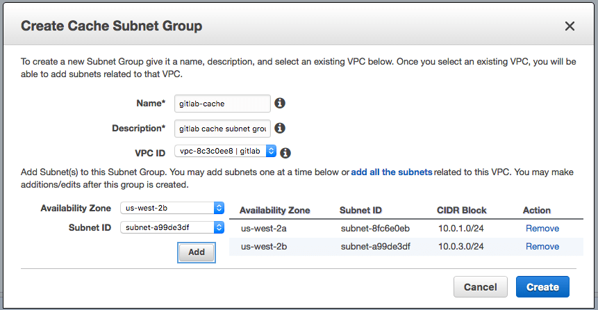 Make sure to choose our gitlab VPC, our subnet group, not have it public,