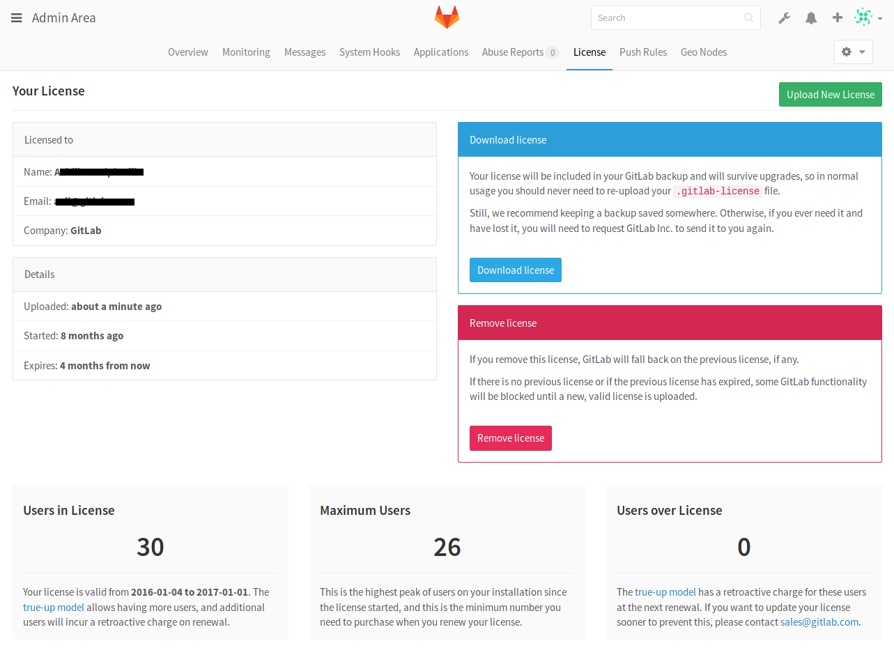 Once you've uploaded your license, all GitLab Enterprise Edition functionality will be active until the end of the license period. You can review the license details at any time in the License section of the Admin Area.