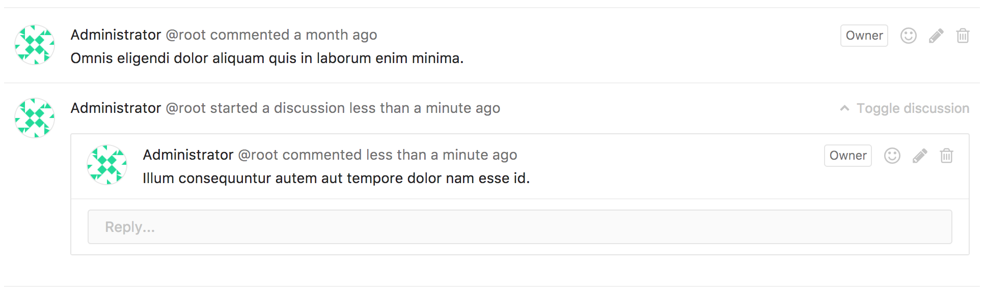 Note: This discussion badge is typically associated with a number that is only used as a visual reference for each discussion. In the merge request discussion tab, this badge will be indicated with a comment icon since each discussion will render a new image section.